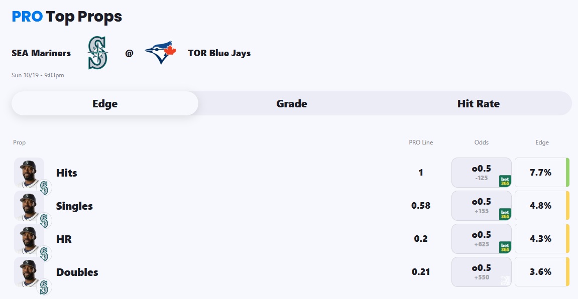 PRO projects Mariners left fielder Randy Arozarena with exactly one hit tonight, which represents a nice 7.7% edge against the market.