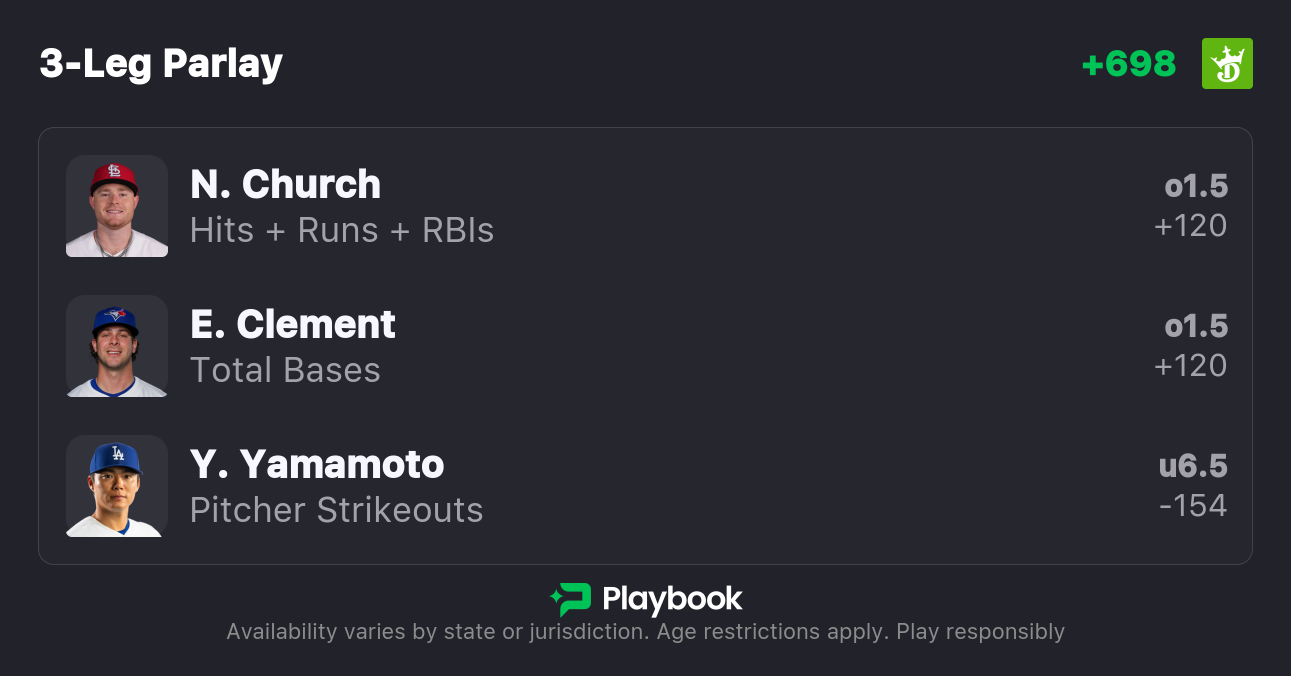 - Nathan Church Over 1.5 Hits + Runs + RBI (+120, DraftKings)