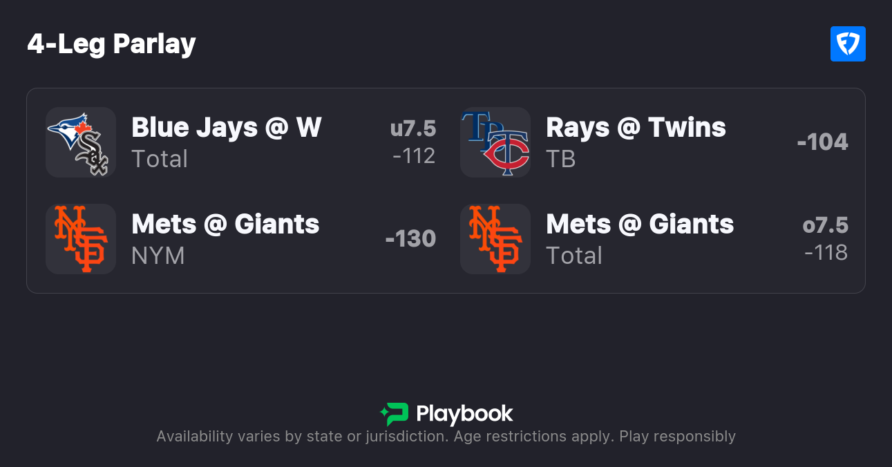 - Blue Jays/White Sox, Under 7.5 (-105, 0.5u), FanDuel, bet to -120