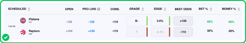 My Raptors vs. Pistons best bet is on Detroit moneyline at -108, but make sure to find the best odds by checking our live NBA odds page.