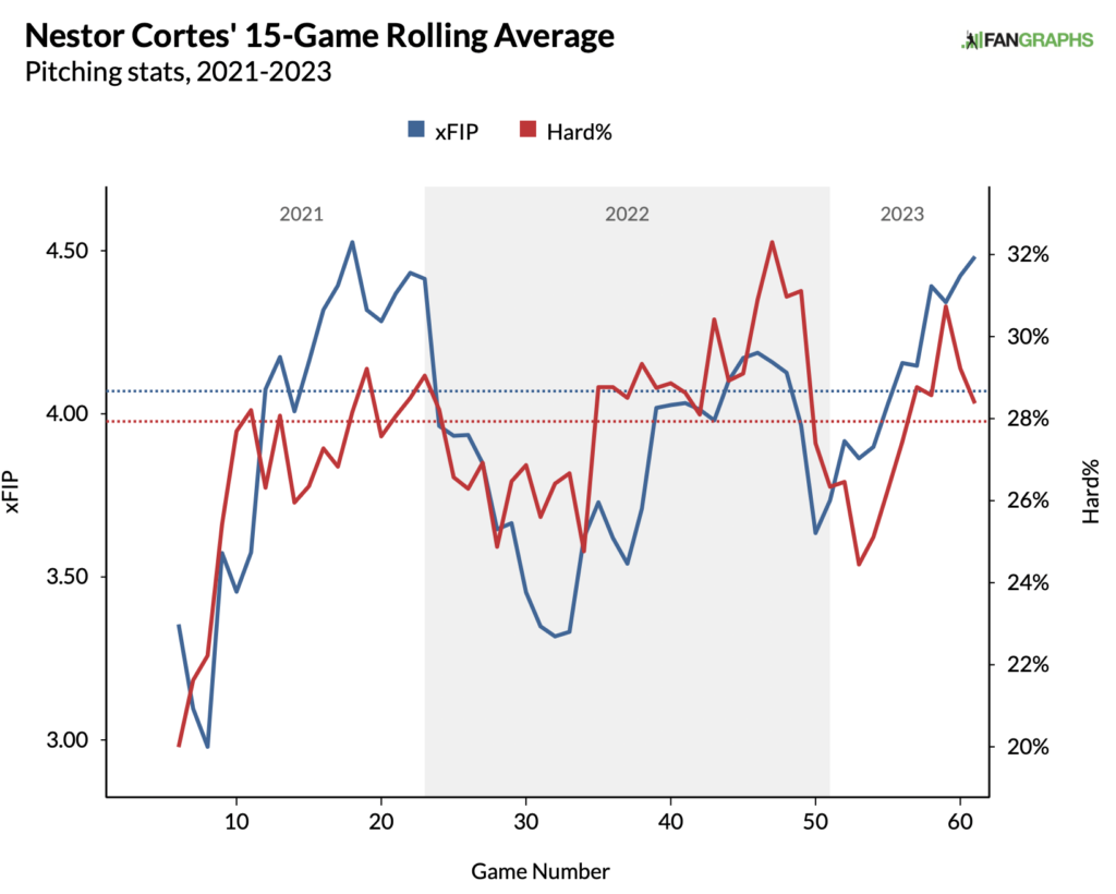 Prior to his injury that put him on the 60-day IL, Cortes had a 3.83 xERA, which is considerably higher than his marks in 2021 (3.30) and 2022 (2.70).