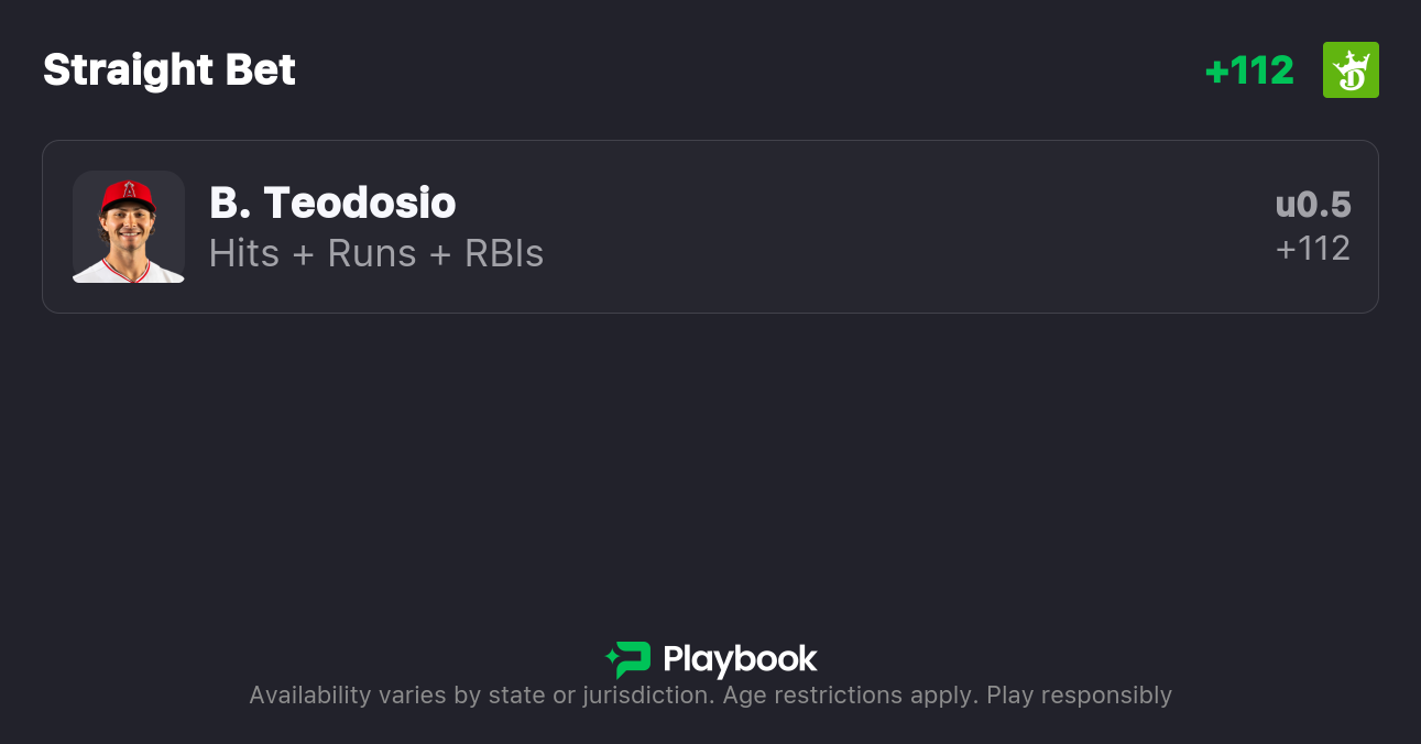 - Angels vs Royals Pick: Bryce Teodosio Under 0.5 Hits, Runs, & RBIs (+112)