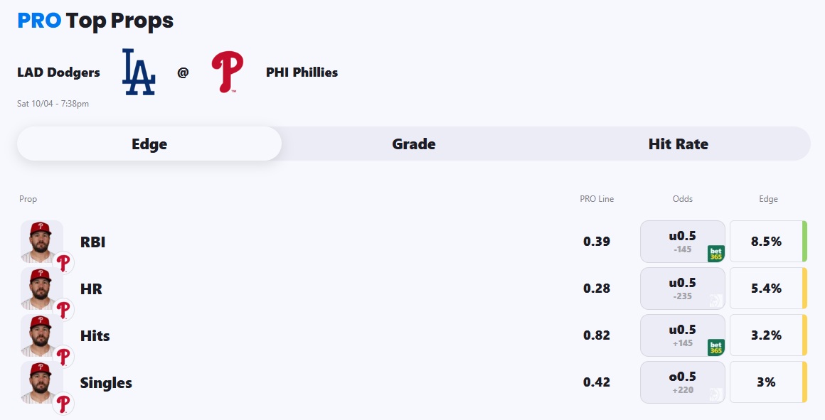 PRO projects Phillies DH Kyle Schwarber with 0.39 RBI today, which represents a nice 8.5% edge against the market.
