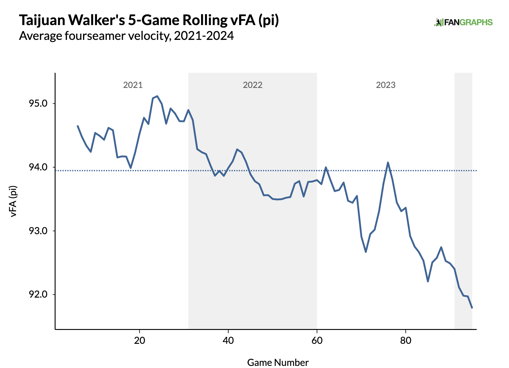 Walker's fastball velocity is down 2.3 mph (93.5 mph in 2022, 93.8 career) over two years, and his Stuff+ rating has declined from 110 to 96 to 87 over the same span.