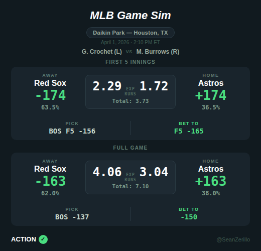 Houston's offense actually projects better against lefties than righties by about 3 points in wRC+, but I still show an edge on Crochet and the Red Sox in both halves; bet Boston's F5 moneyline at -165, and play their full game line to -150.