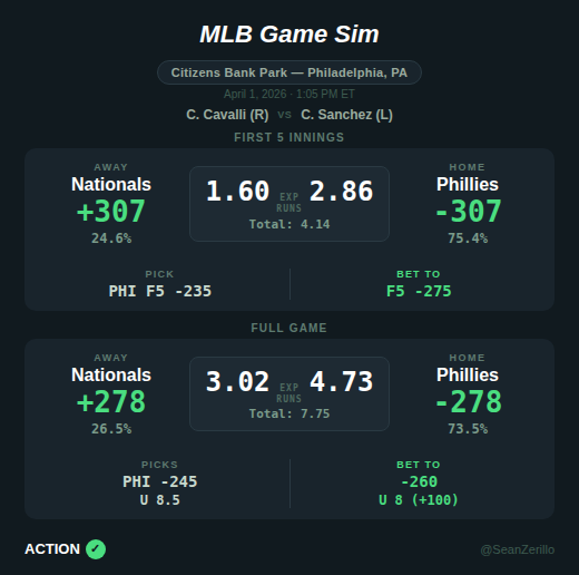 Still, similar to the Braves-A's analysis, my projected gap between the starting pitchers (Sanchez and Cavalli) in terms of weighted FIP (about 1.4 runs) is wider than the projected gap between the bullpens (about 0.9 runs), and as a result, I show a bigger edge on the Phillies on the F5 moneyline as compared to the full game; take them in the first half up to -275, or for the full game to -260.