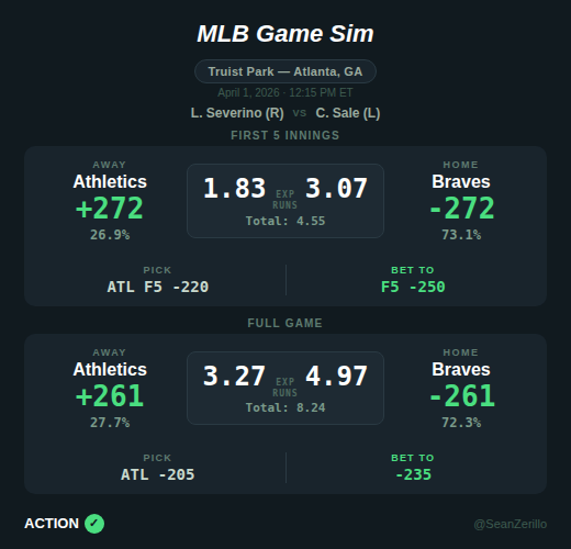 I projected the Braves near -275 for the first five innings (F5), and priced them closer to -260 for the full game. The gap between Sale and Severino (about 1.5 runs on a weighted FIP projection) is larger than the gap between the bullpens (closer to three-quarters of a run).