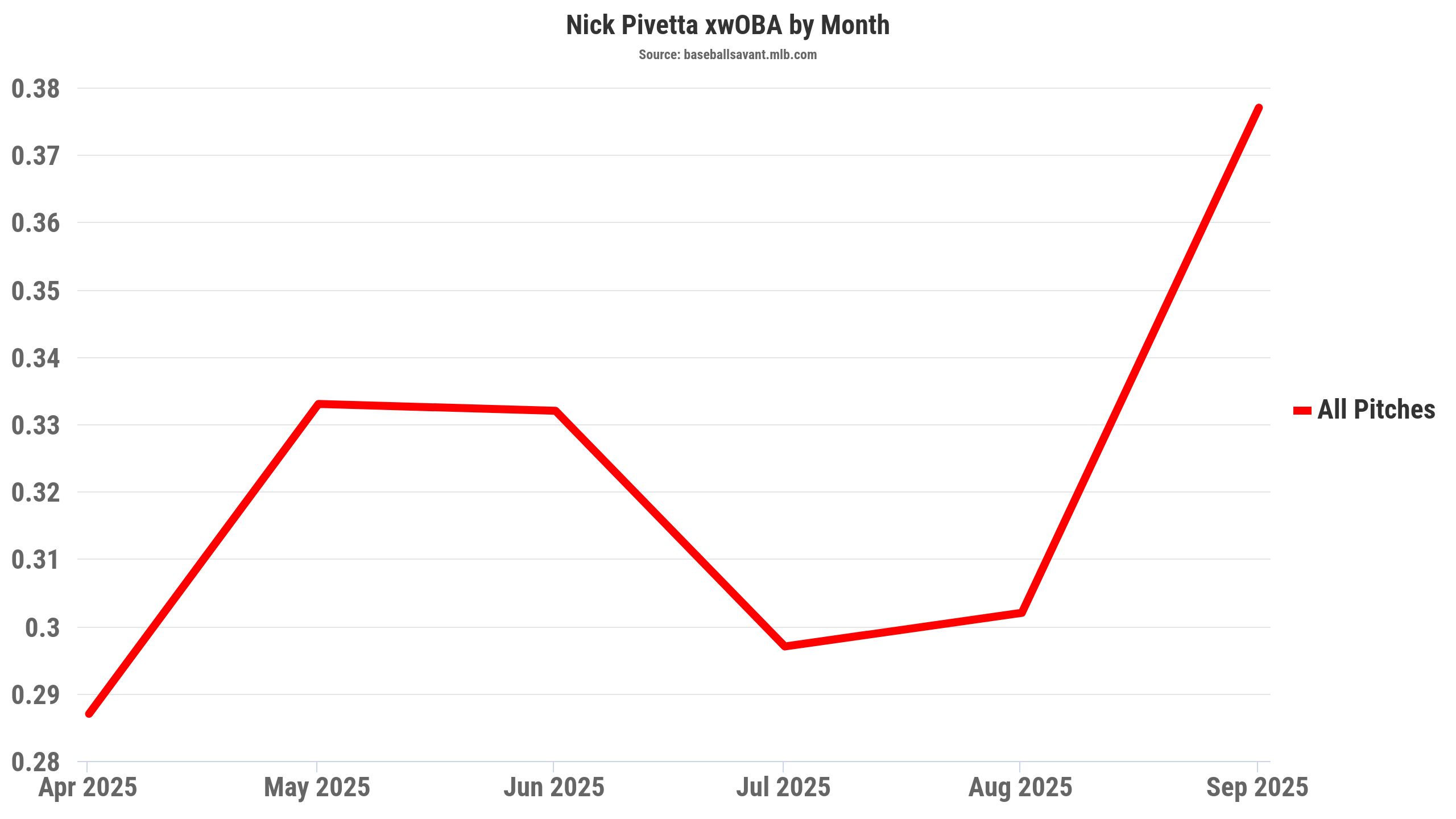 Nick Pivetta overachieved (2.87 ERA, 3.99 xERA, 3.85 xFIP, 3.72 botERA) thanks to a career-best BABIP (.235 vs. .292 career), strand rate (78.7% vs. 72.5% career), and HR/FB ratio (9.7% vs. 14.3% career). He pitched to a 4.20 over the final two months of the season.
