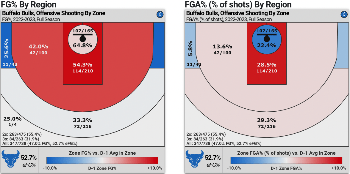 However, Buffalo can't shoot and is one of the worst spot-up teams in the nation (.786 PPP, 7th percentile). That lack of shooting means the Bulls often stall out in the halfcourt, although their pick-and-roll and handoff metrics are solid.
