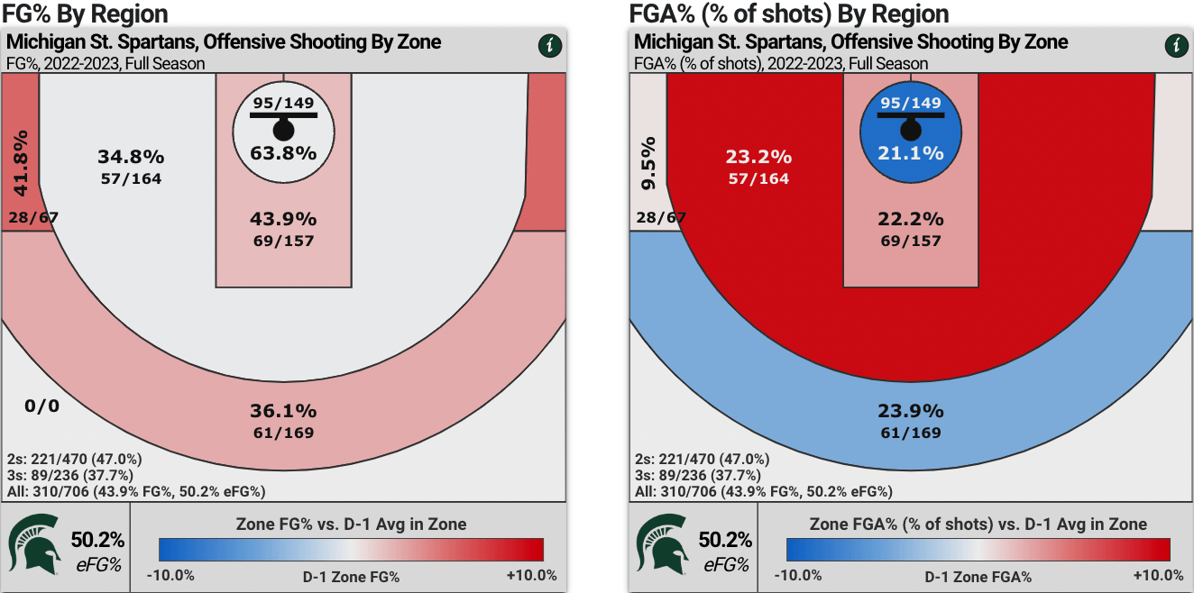 But the interior scoring isn't there. Despite taking 40 two-point attempts per game (75th percentile), Sparty is making just 47% of them (15th percentile).