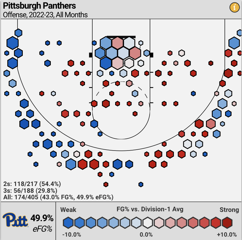 The Wildcats are top 10 in Adjusted Defensive Efficiency. They defend both the arc and interior extremely well, and since Pitt is not an offensive juggernaut, they should do the same here.