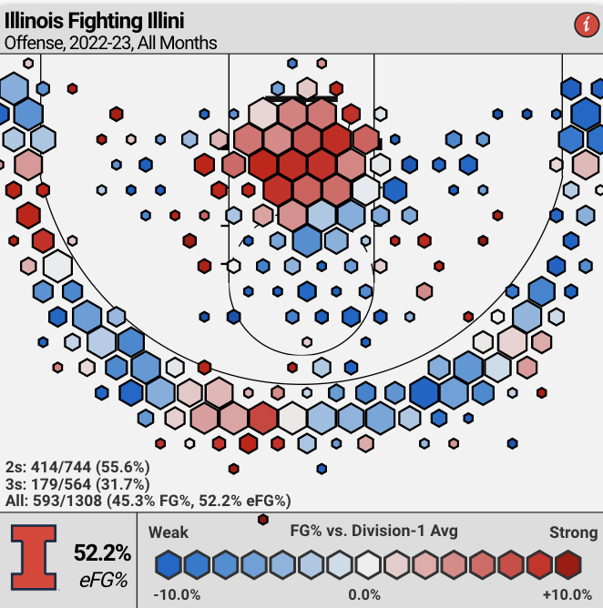 The Illini rely heavily on 3s — ranking 50th in 3-point attempt percentage — so this is what brings their overall offensive efficiency down.