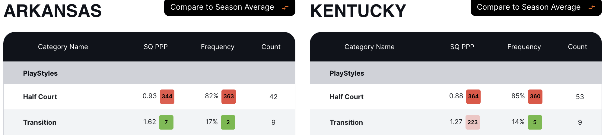 Kentucky is a fairly high frequency transition team, so it'll have to improve if it wants to beat Arkansas this time around.
