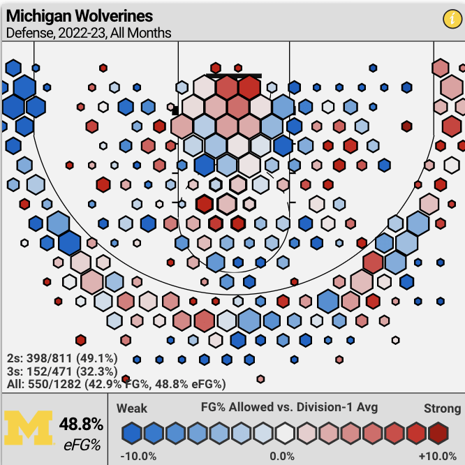 The Wolverines also do play reasonable defense on the perimeter. Opponents are shooting around 32% against them and under 50% on 2s.