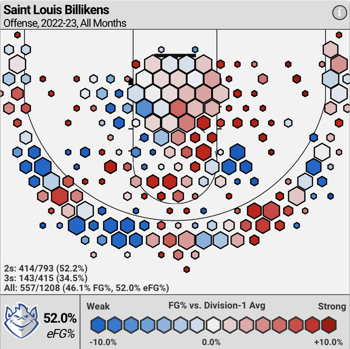 Saint Louis can defend the interior. It ranks 56th in points per possession (PPP) against teams finishing at the rim. It also ranks 58th in PPP in the half-court.