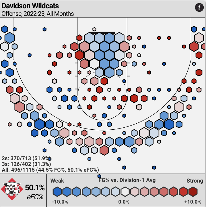 The Billikens also rank 278th in 3-point attempt percentage and manufacture around 54% of their points off of 2's. They are also about league-average in free-throw attempt percentage offensively. Unfortunately, the Davidson Wildcats are strong with both interior and exterior defense. Per Shot Quality, Davidson ranks 37th in 3-point defense and 57th in shots attacking the rim. Since Saint Louis takes so many 2's, this pairing will not play into the Billikens' hands.