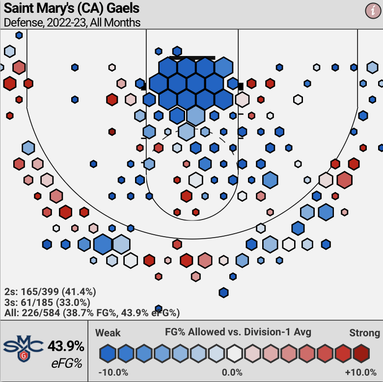 Now, Saint Mary’s does struggle to defend the arc — allowing opponents to hit 33% from 3 — so the Aggies will produce when given the opportunity. That said, the Gaels are so strong in every other defensive category that the Aggies will be greatly restricted in other areas.