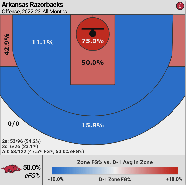 Yes, the 3s are a bit lacking, but they can get to the line. Arkansas may turn opponents over consistently, but it ranks 44th in opponent 3-point percentage and 72nd in opponent 2-point percentage.