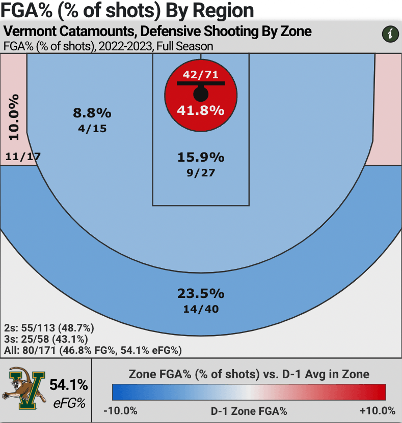 Defensively, opponents are getting to the rim at a top-70 rate (54.1%). When opponents aren't making their rim shots, they're getting fouled, as Vermont gifted Cal State Fullerton 42 free throws.