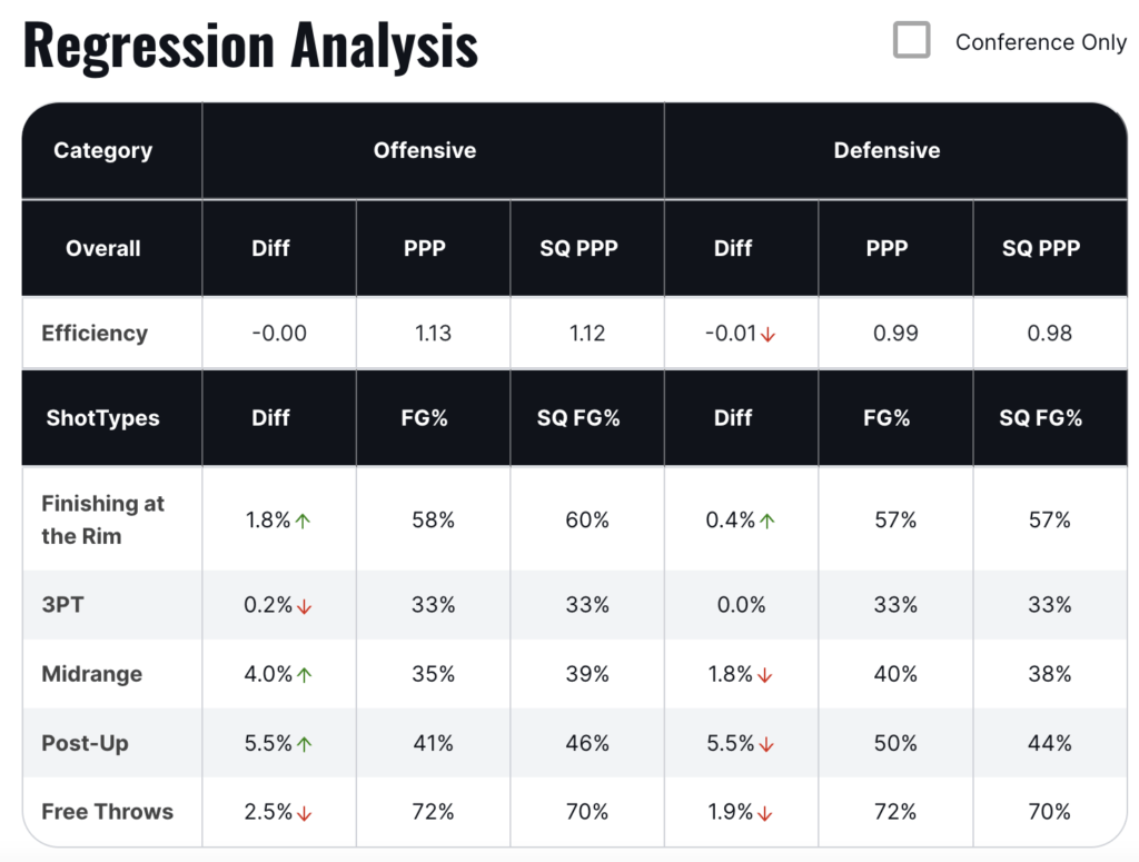The problem is they're shooting over 38% from 3-point range but have one of the lowest 3-point rates in the country. They're also getting to the rim at a very low percentage, as their rim and 3-point rate ranks 358th in the nation.