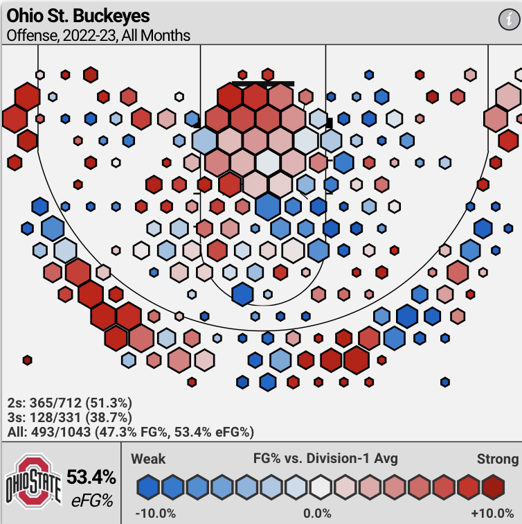 Now, this matters in this game because the Buckeyes rank in the top 25, per Shot Quality, in shots attacking the rim and on efficient 3s. They also rank 11th in posting up, which they should take full advantage of with no Gary and perhaps no Keita for Nebraska.