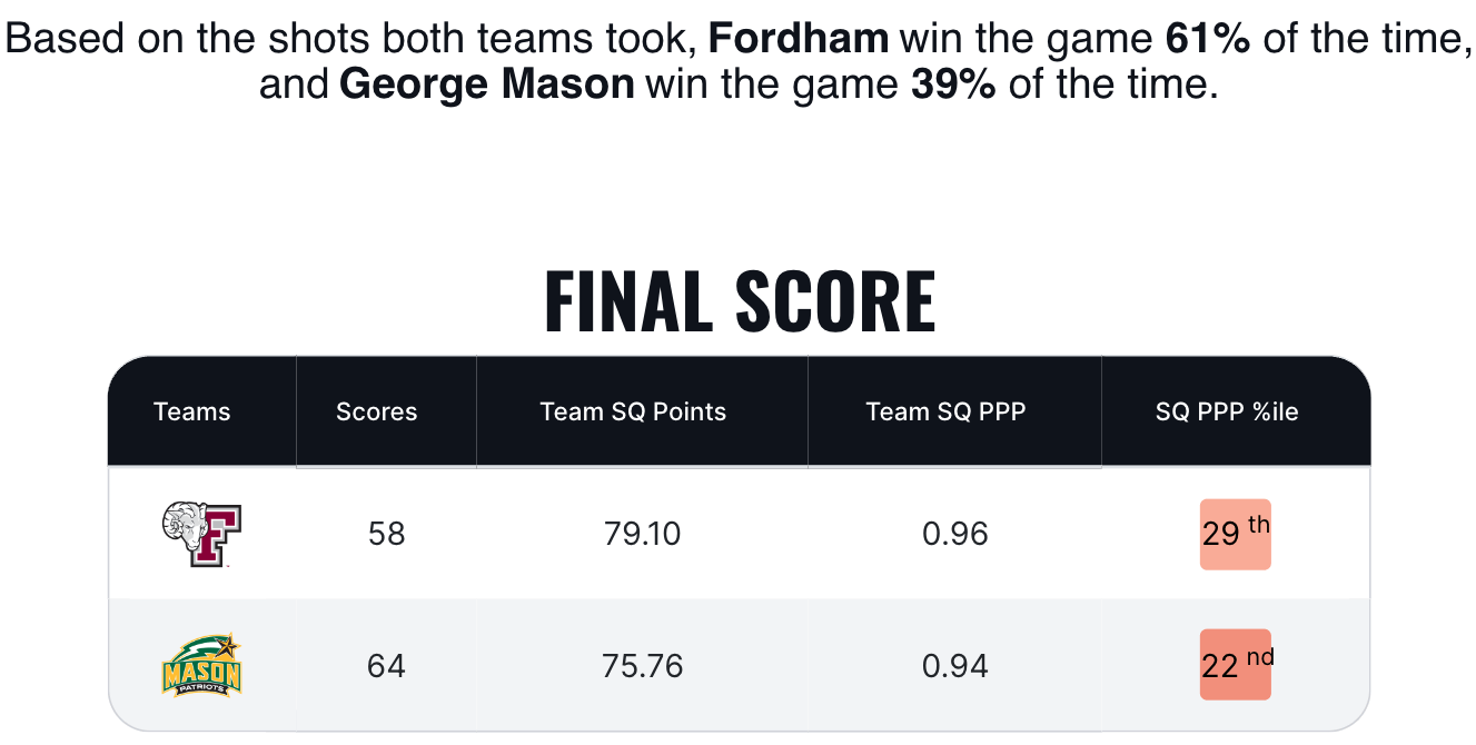 We can also target Fordham for some game-to-game positive regression. The Rams only lost against George Mason because they shot 3-for-25 from 3, and ShotQuality unsurprisingly graded that game as an analytical Fordham win.