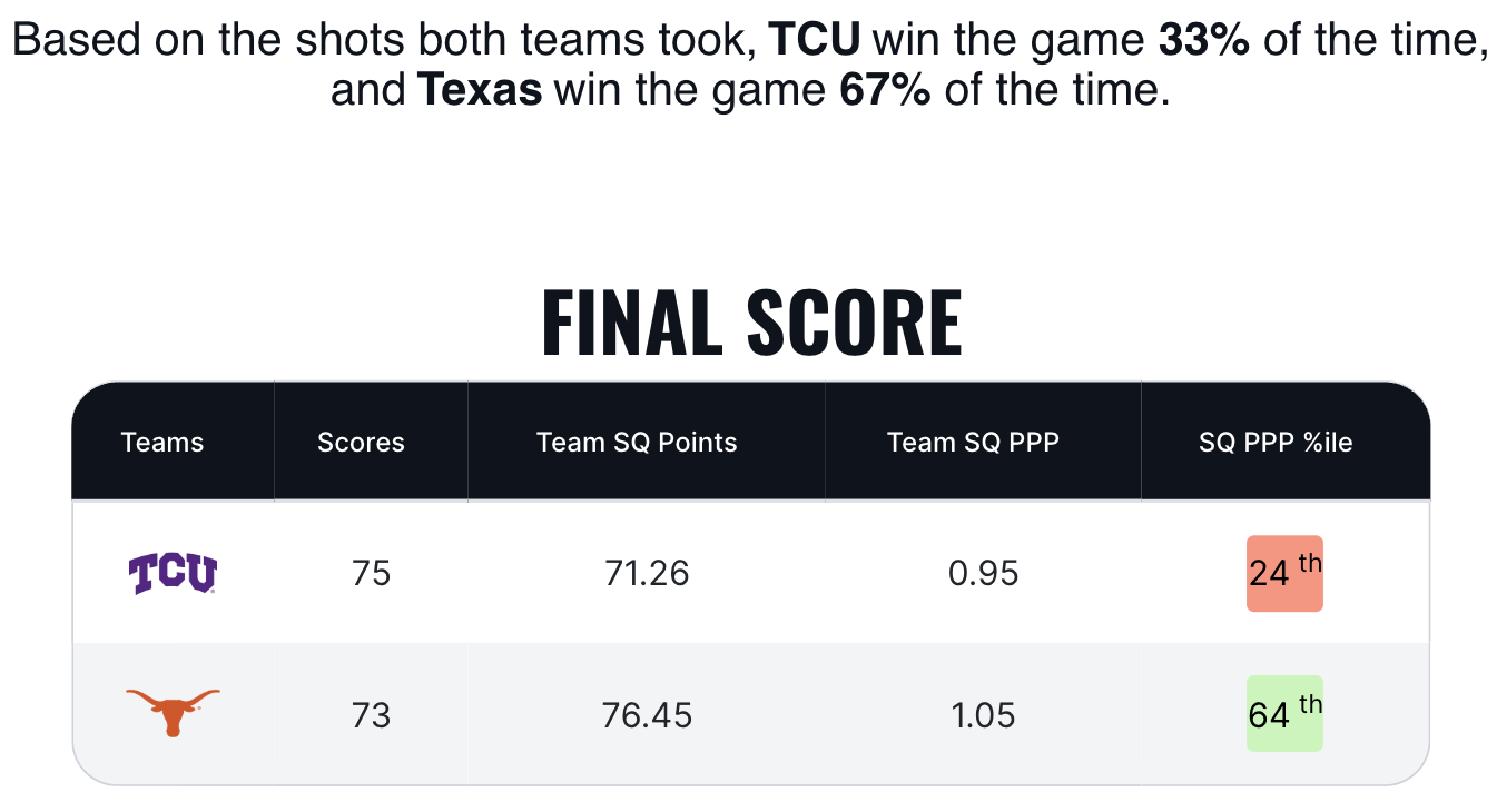 Not only that, but we can target Texas for some game-to-game positive regression. Texas’ three-point loss to TCU was graded as a five-point analytical win by ShotQuality, proving the Frogs were a little lucky to come out on top.