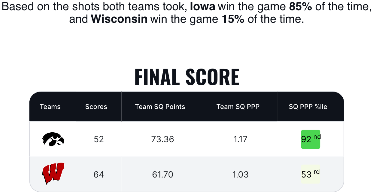 First, Iowa’s loss against Wisconsin was graded as an analytical win by ShotQuality.