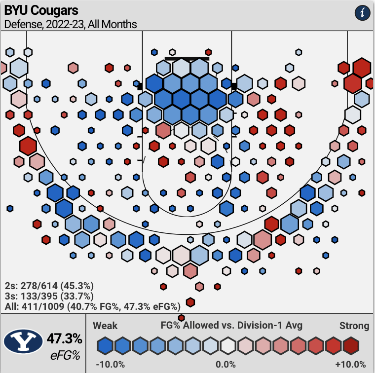 BYU is only giving up a two-point field goal percentage of 45.6%, but teams are getting 32.5% of their points on twos off of the Cougars. This means there should still be opportunities for the Zags to produce inside.