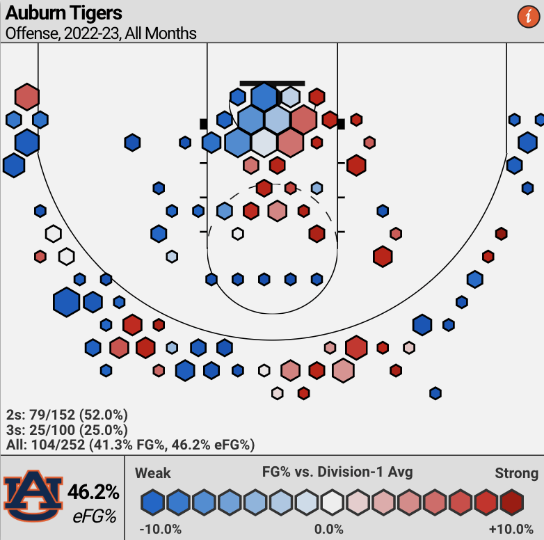 Auburn runs at the 91st-ranked Adjusted Tempo in the country. It only shoots 25% from deep while launching a ton of 3s, so much of its scoring distribution comes from drawing contact and pushing the ball up the floor in transition.