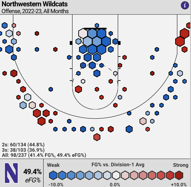 Northwestern may be able to defend taller players and snag boards, but it cannot hit an inside shot to save its collective lives. The Wildcats are shooting 44.8% on 2-pointers and 36.9% from outside.