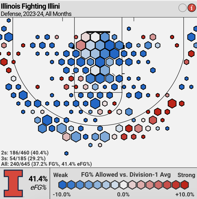 When Mizzou gets inside the arc, its offense ranks 86th in Rim and 3 Rate, which is solid. However, the Illini rank second defensively in Rim and 3 Rate, so Missouri shouldn't get many open looks.