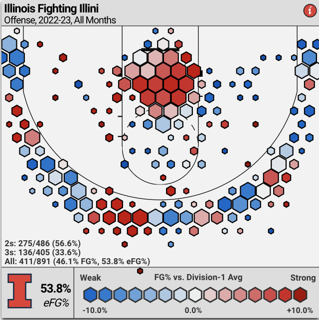 Building off of that, Illinois is even more efficient inside the arc, shooting 56.6%. Nebraska is permitting a 2-point field goal percentage of 48.2%, so the Illini should have opportunities on the interior.