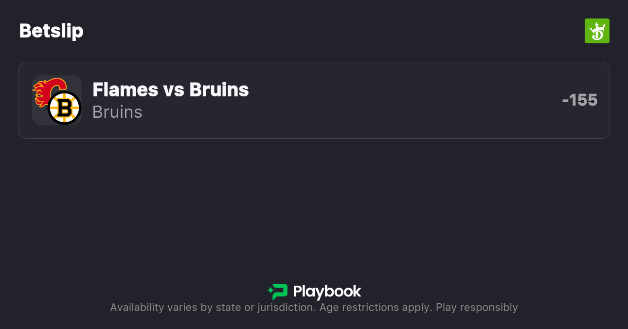Flames vs. Bruins Moneyline: Flames +130, Bruins -155