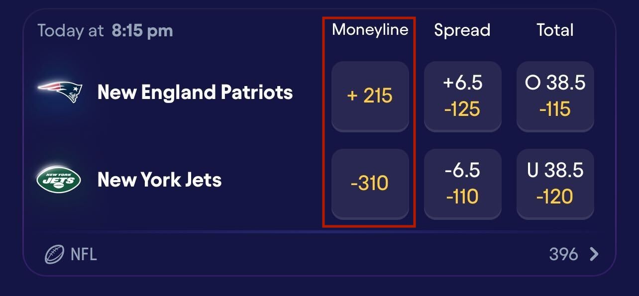 Moneyline: Moneyline betting is when you pick the outright winner of a game or event. Jets are the favorite at -310 over the underdog Patriots at +215 |