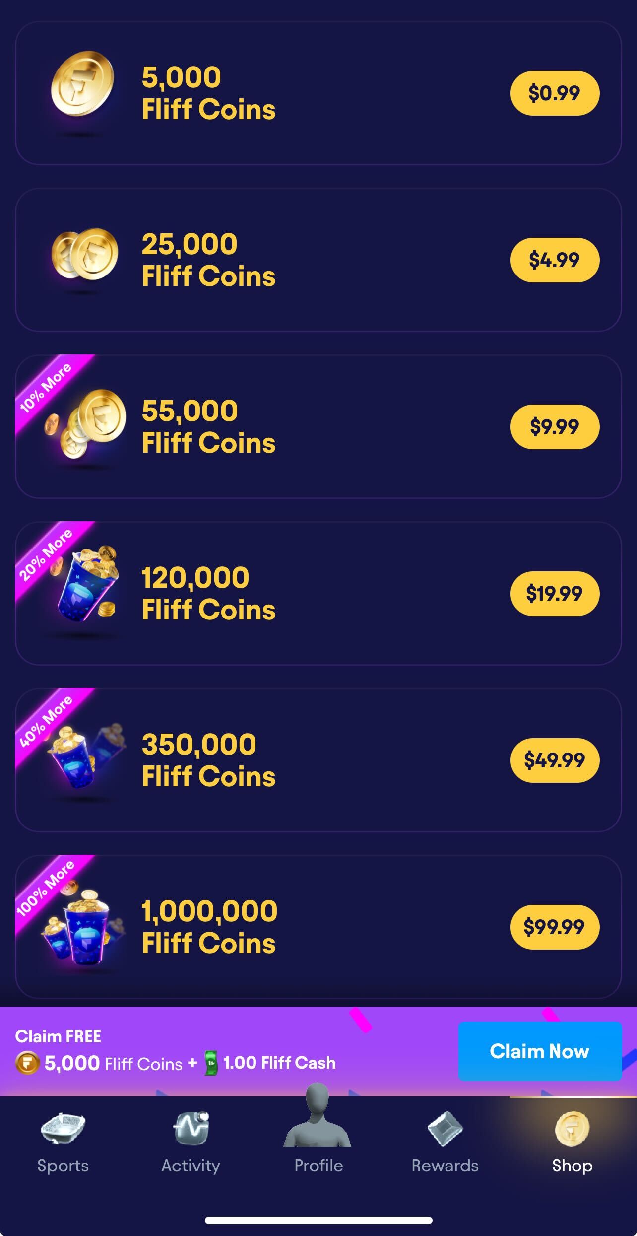 Fliff Coins themselves do not have any real-money value. However, the can be exchanged into Fliff Cash at a rate of 1,000 Fliff Coins to 0.10 Fliff Cash. For those users who are purely on Fliff Social Sportsbook to play for fun, Fliff Coins are the most important currency.