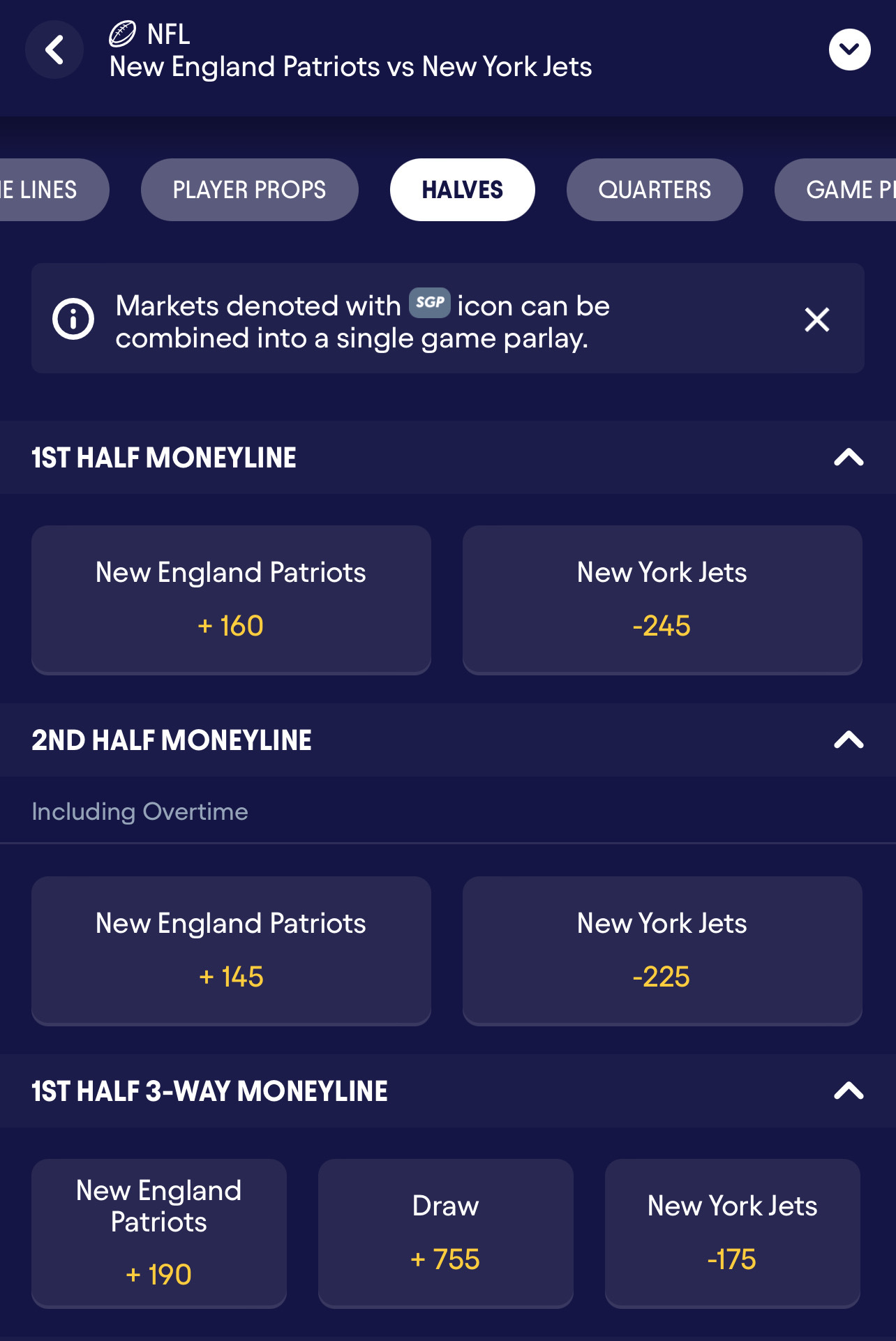 Half Bets: Half-bets or Quarter bets let a bettor treat the first and second half as separate matches. Depending on the sport, you can also bet quarters. Jets are favored in a variety of half bets in the upcoming game against the Patriots |